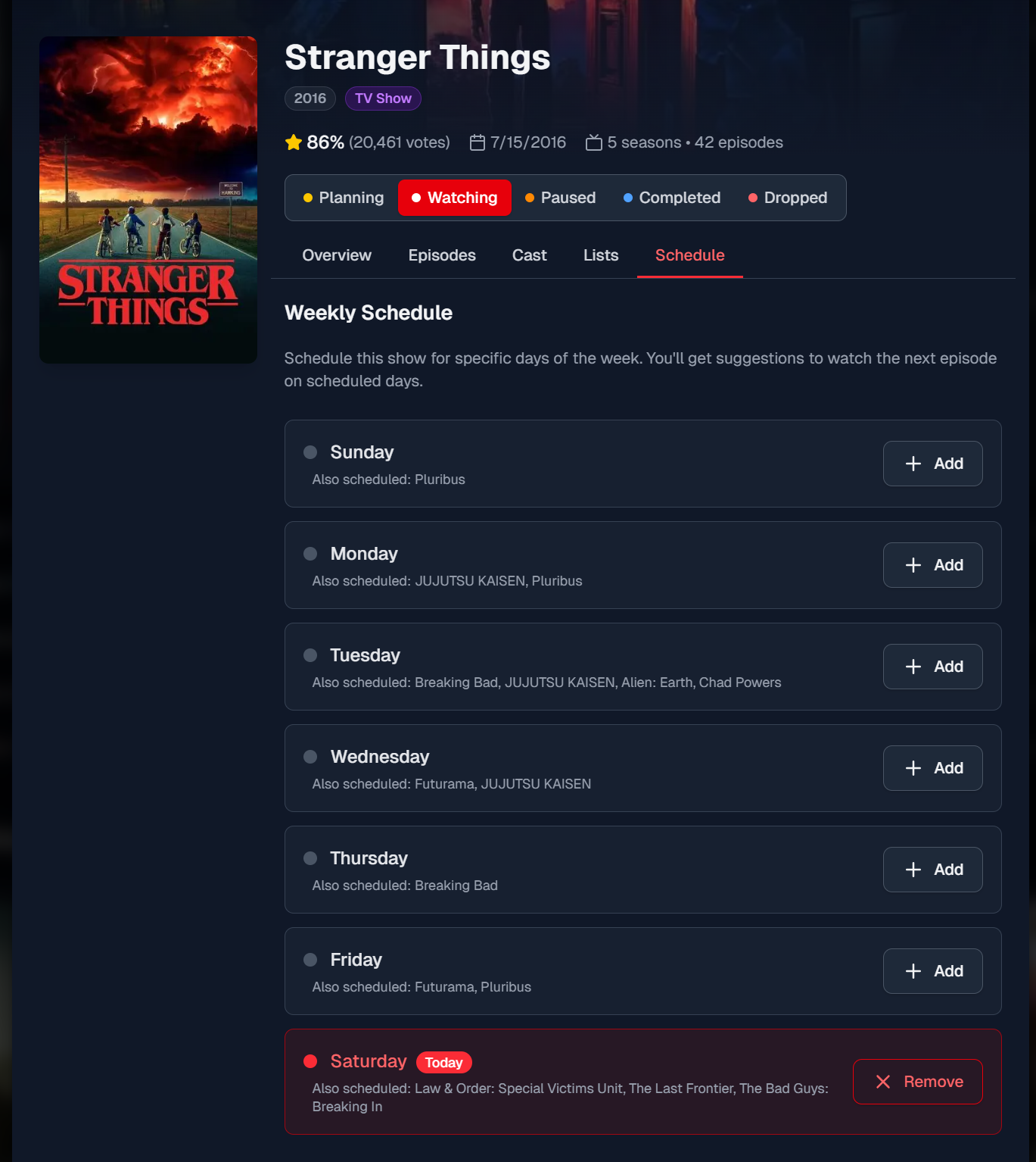 Schedule TV shows on specific days and get “next episode” prompts.